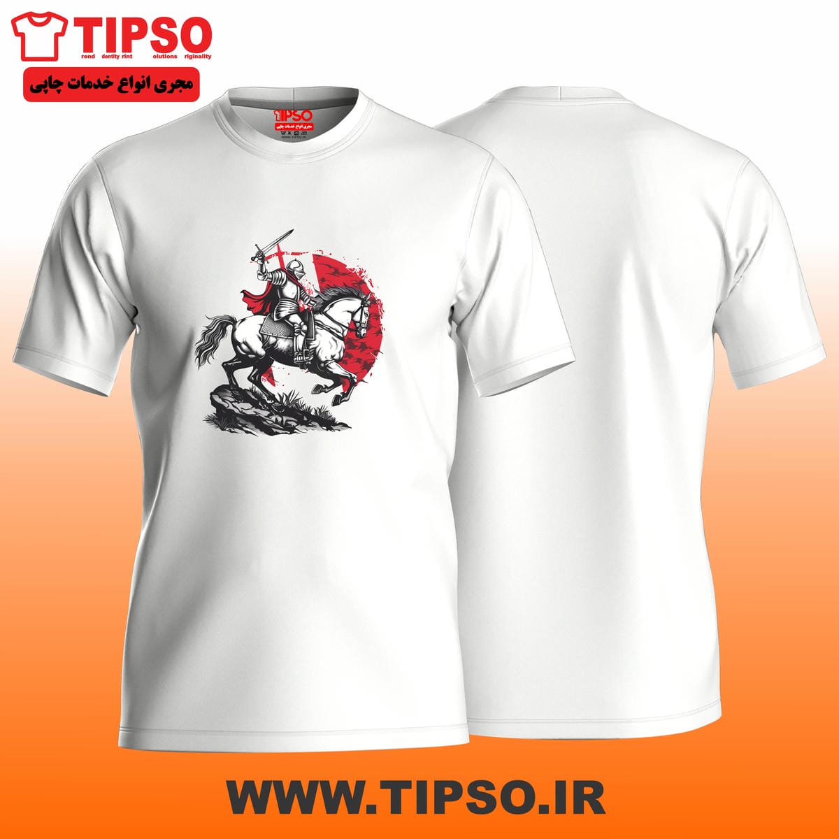 تیشرت سفید با طرح شوالیه سوار بر اسب و خورشید قرمز — حس شجاعت، قدرت و جنگجویی رو منتقل میکنه. مناسب برای علاقهمندان به شخصیتهای تاریخی و استایلهای خفن.