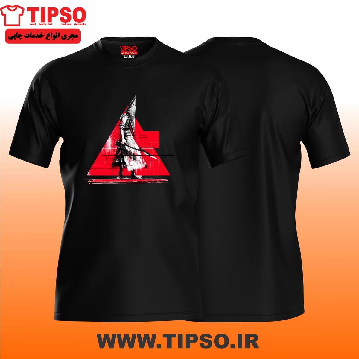 تیشرت مشکی با طرح شخصیت ماسک مثلثی و پس‌زمینه قرمز — حس ترس، رازآلودگی و خطر رو منتقل می‌کنه. مناسب برای علاقه‌مندان به فیلم‌های ترسناک و استایل‌های خفن.
