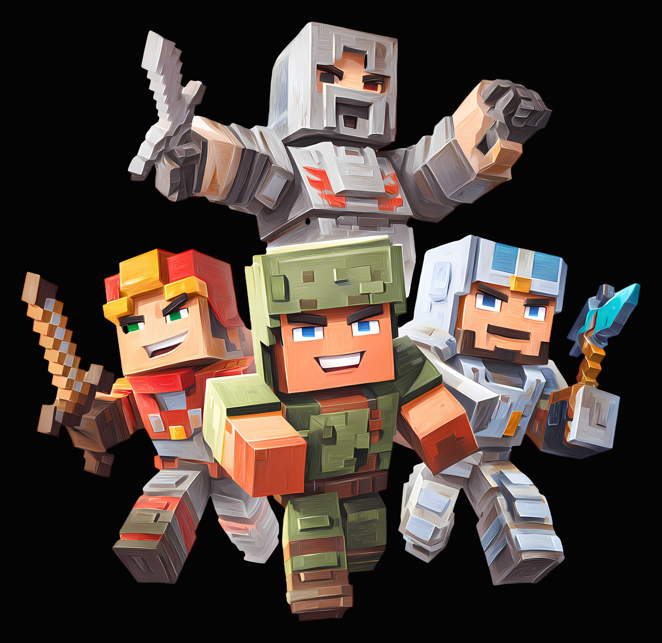 این طرح حرفهای با سبک پیکسلی-کارتونی و الهامگرفته از دنیای بازیهای مدرن مانند Minecraft یک تیم چهارنفره از ماجراجویان قهرمانانه را به تصویر میکشد. هر کدام با لباس، سلاح و شخصیت منحصر به فرد، احساس تیموری، شجاعت و ماجراجویی را منتقل میکنند!