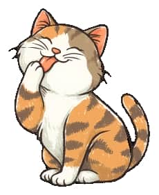 طرح کارتونی از گربه نارنجی با نوارهای قهوهای، گوشهای صورتی و بدن سفید، در حالت نشسته و در حال لیسیدن پنجه. طراحی با حالت آرام و شاد، مناسب برای چاپ روی لباسهای کودکانه، اسپرت و دیواری.