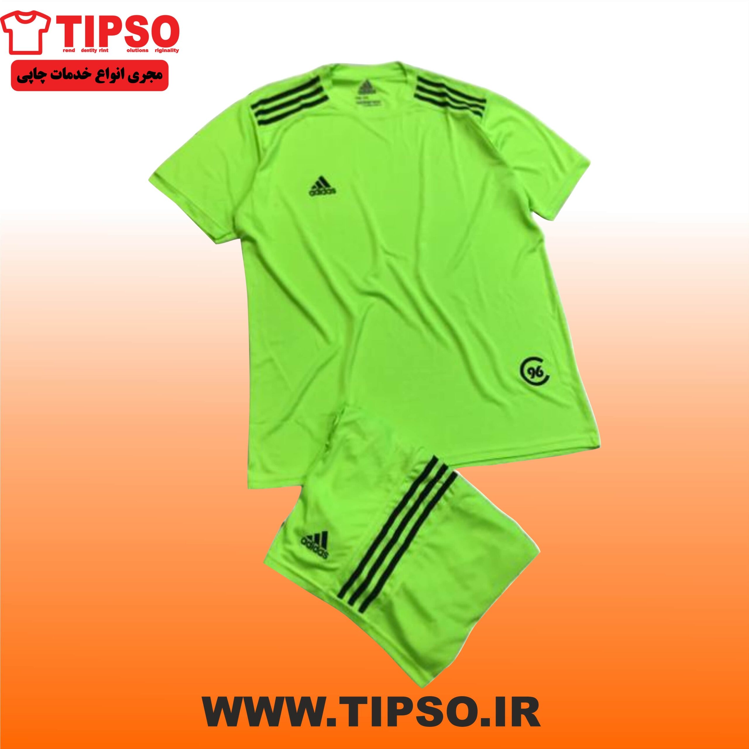 ست ورزشی فسفری با طراحی مشکی و لوگوی Adidas، جنس فلامنت، چاپ سابلیمیشن، مناسب برای باشگاه، تمرین و مسابقه.