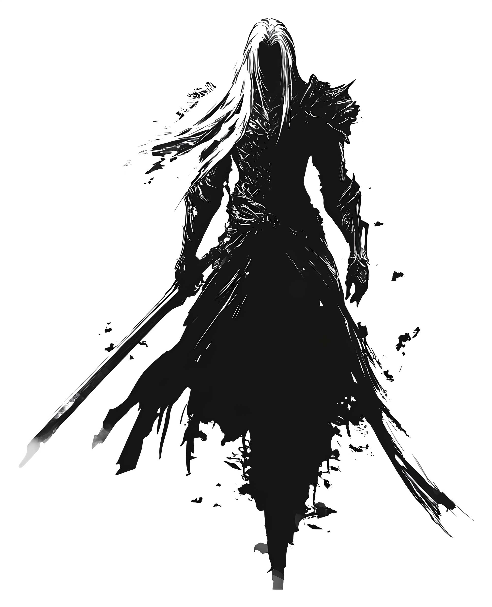 طرح زن جنگجوی تاریک با لباس سنتی، شمشیر بلند، موی بلند و پوسترهای فرشته‌وار — حس قدرت، رازآلودگی و جنگجویی رو منتقل می‌کنه. مناسب برای طرح‌های لباس زنانه و علاقه‌مندان به شخصیت‌های قهرمانانه.