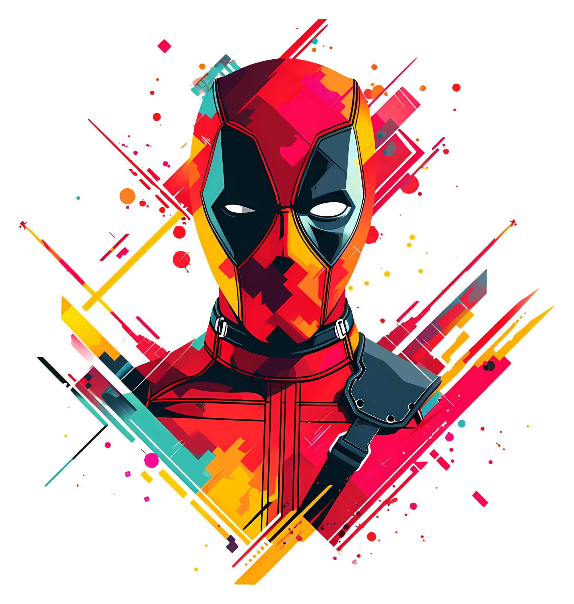 این طرح شامل دیدی (Deadpool) در حالت نیمهنهایی با طرح هندسی و رنگهای زرد، قرمز، صورتی و آبی است. طراحی دقیق با الگوهای چندضلعی و افکتهای پراکنده، مناسب برای چاپ روی تیشرت، کلاه، کیف و لباس بچهگانه.