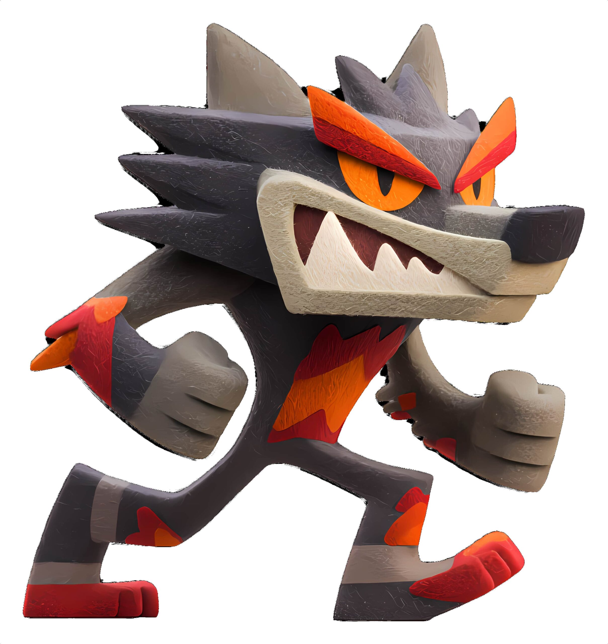 طرح کارتونی از گرگ‌نمای عضلانی با حالت دویدن، چشمان نارنجی، دندان‌های تیز و رنگ‌بندی خاکستری، قرمز و نارنجی. طراحی با بافت چوبی و ژست اکشن، مناسب برای چاپ روی لباس‌های اسپرت، فانتزی و دیواری.