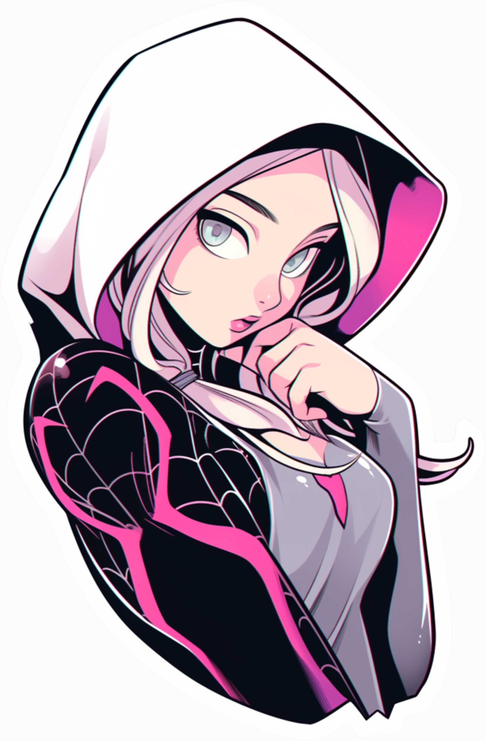 این طرح شامل گوگل سیمپسون (Gwen Stacy)، نسخه زنانه مرد عنکبوتی، در حالت نیمه‌نهایی با کلاه چادری سفید و صورتی و لباس مشکی و صورتی است. طراحی با رنگ‌های صورتی، مشکی و سفید، همراه با طرح شبکه، مناسب برای چاپ روی تیشرت، کلاه، کیف و لباس بچه‌گانه.
