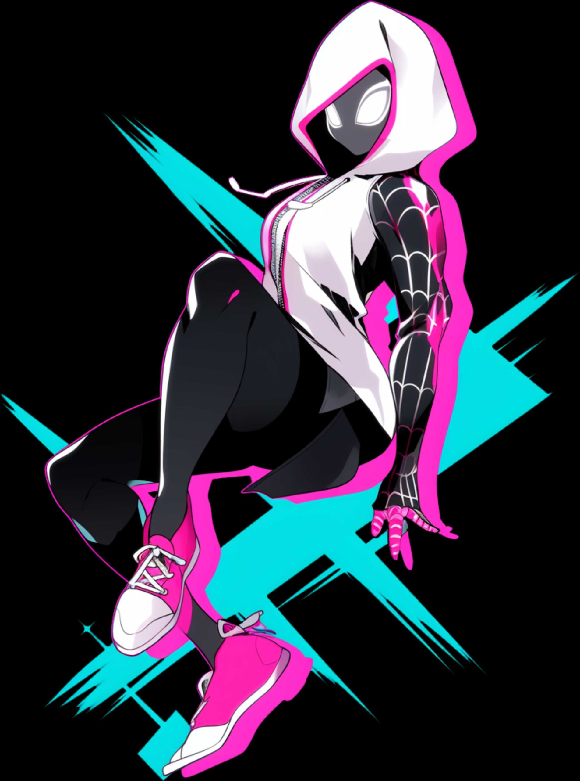 این طرح شامل گوگل سیمپسون (Gwen Stacy)، نسخه زنانه مرد عنکبوتی، در حالت خم شده با کلاه چادری صورتی و لباس مشکی و سفید است. طراحی با رنگهای صورتی، مشکی و سفید، همراه با افکتهای آبی، مناسب برای چاپ روی تیشرت، کلاه، کیف و لباس بچهگانه.