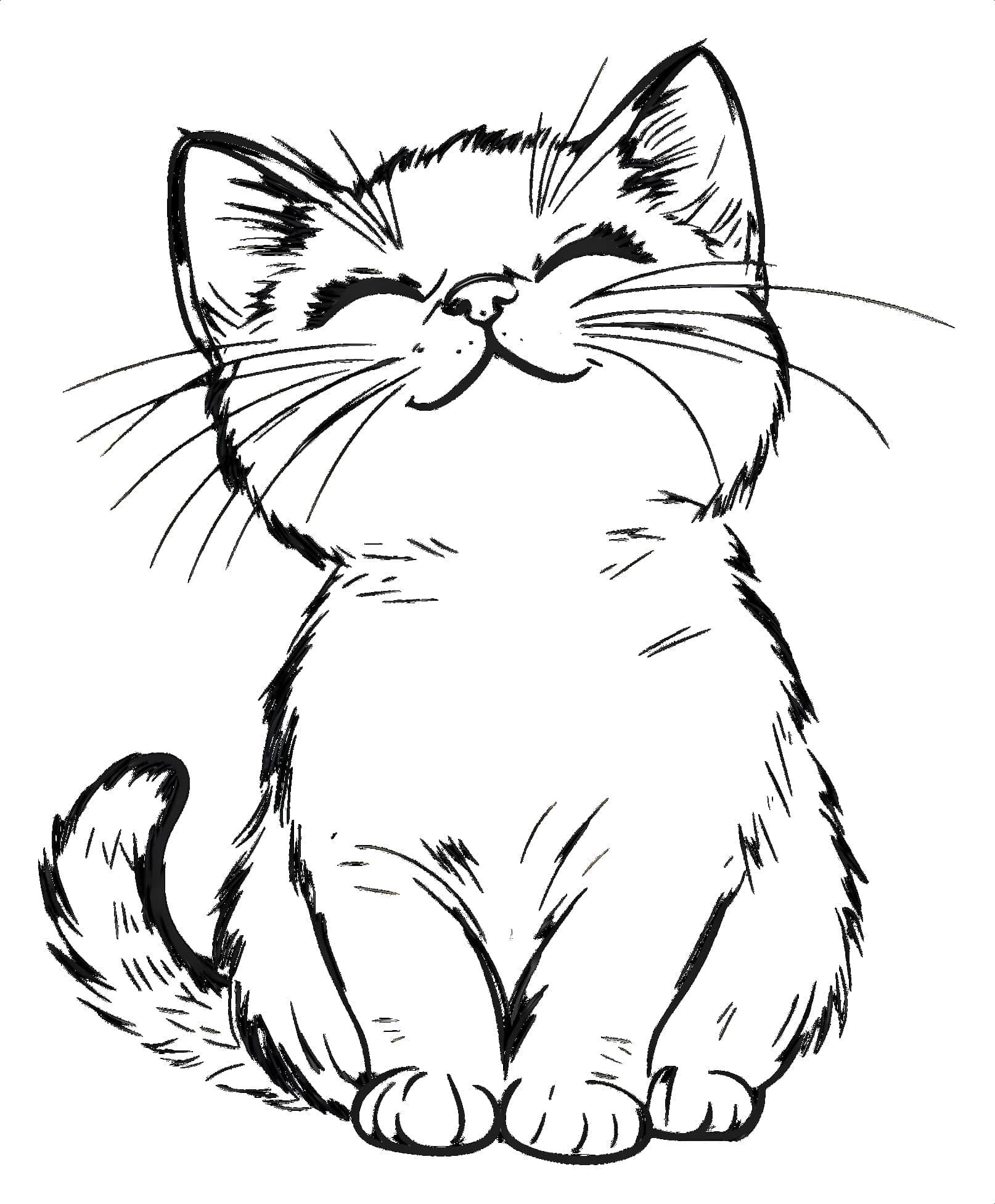 طرح خطی سیاه‌وسفید از بچه‌گربه در حالت نشسته با چشمان بسته و لبخند آرام. طراحی ساده، شاد و مناسب برای چاپ روی لباس‌های کودکانه، اسپرت و دیواری. قابل استفاده در رنگ‌آمیزی یا چاپ‌های مینیمال.