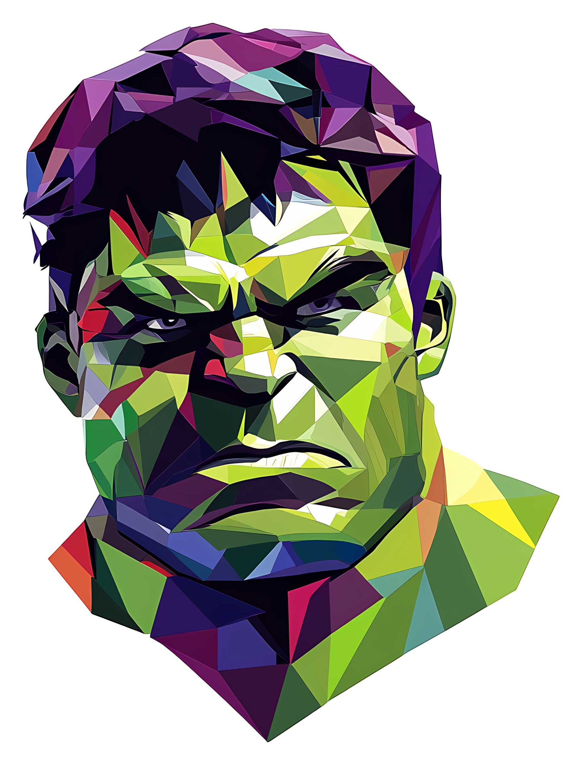 این طرح شامل هالک (Hulk) در نسخه هندسی و چندضلعی، با رنگهای سبز، بنفش، زرد و قرمز است. طراحی دقیق با الگوهای مثلثی و پراکنده، مناسب برای چاپ روی تیشرت، کلاه، کیف و لباس بچهگانه.