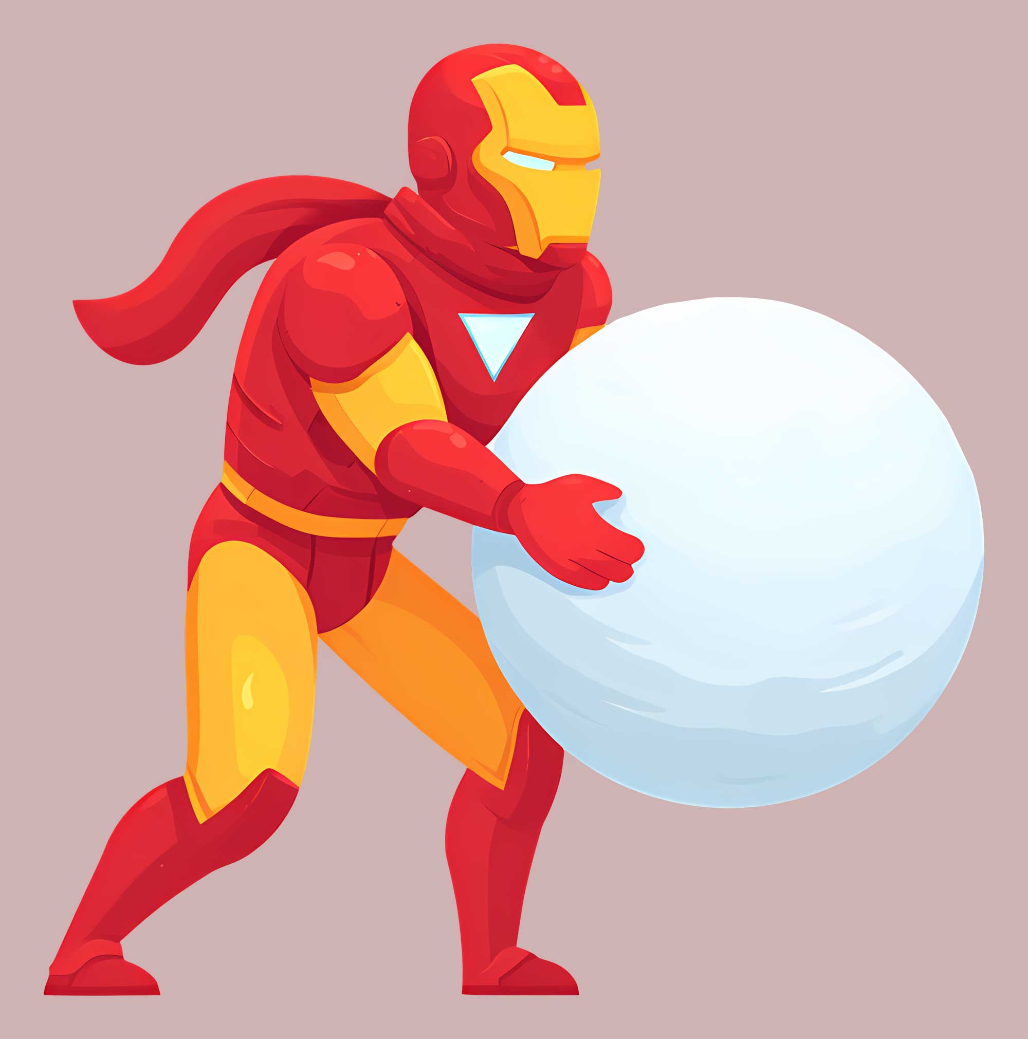 این طرح شامل ایرون من (Iron Man) در حالت حرکت با گلوله برفی بزرگ در دست است. طراحی دقیق با رنگ‌های قرمز، زرد و سفید، همراه با لباس فضایی و پرچم، مناسب برای چاپ روی تیشرت، کلاه، کیف و لباس بچه‌گانه.