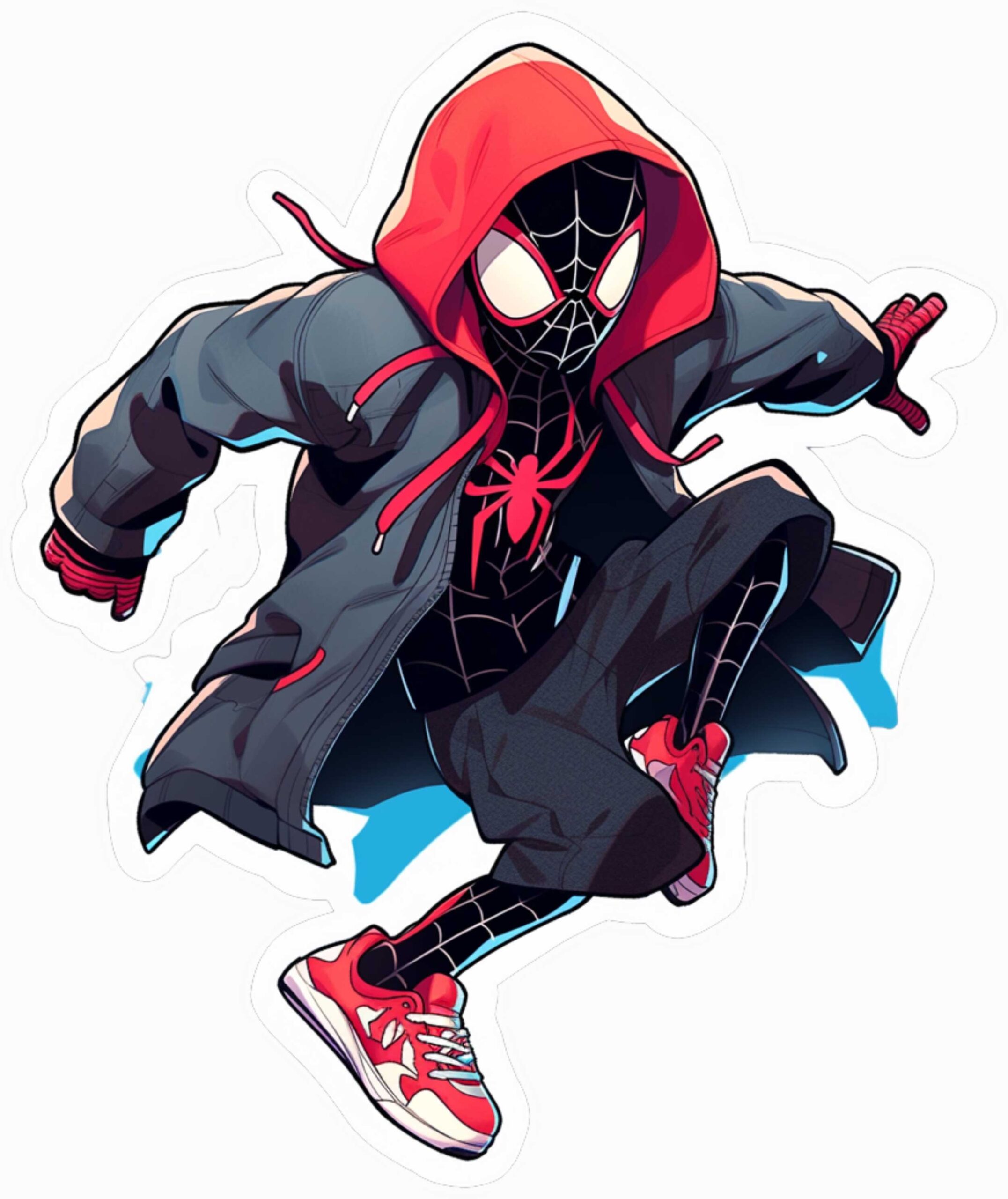 این طرح شامل میلز مورالس (Miles Morales)، نسل جدید مرد عنکبوتی، در حال حرکت با کلاه چادری قرمز و لباس مشکی است. طراحی با رنگ‌های قرمز، مشکی و سفید، همراه با کفش‌های ورزشی و افکت‌های آبی، مناسب برای چاپ روی تیشرت، کلاه، کیف و لباس بچه‌گانه.