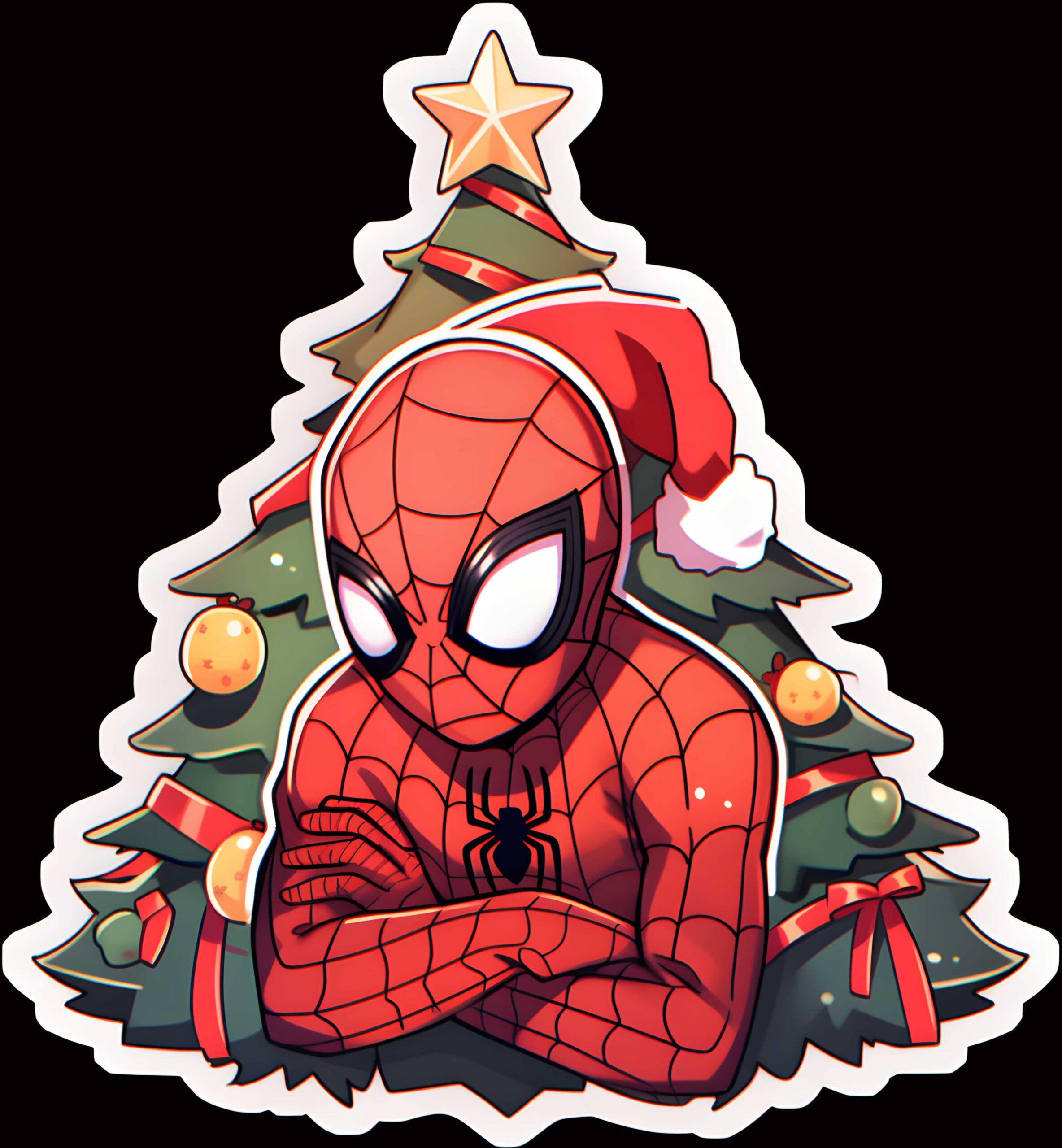خانه چاپ دی تی اف اسپایدرمن-spiderman چاپ طرح DTF اسپایدرمن کریسمس | spider-man با کلاه بابا نوئل در جلوی درخت کریسمس