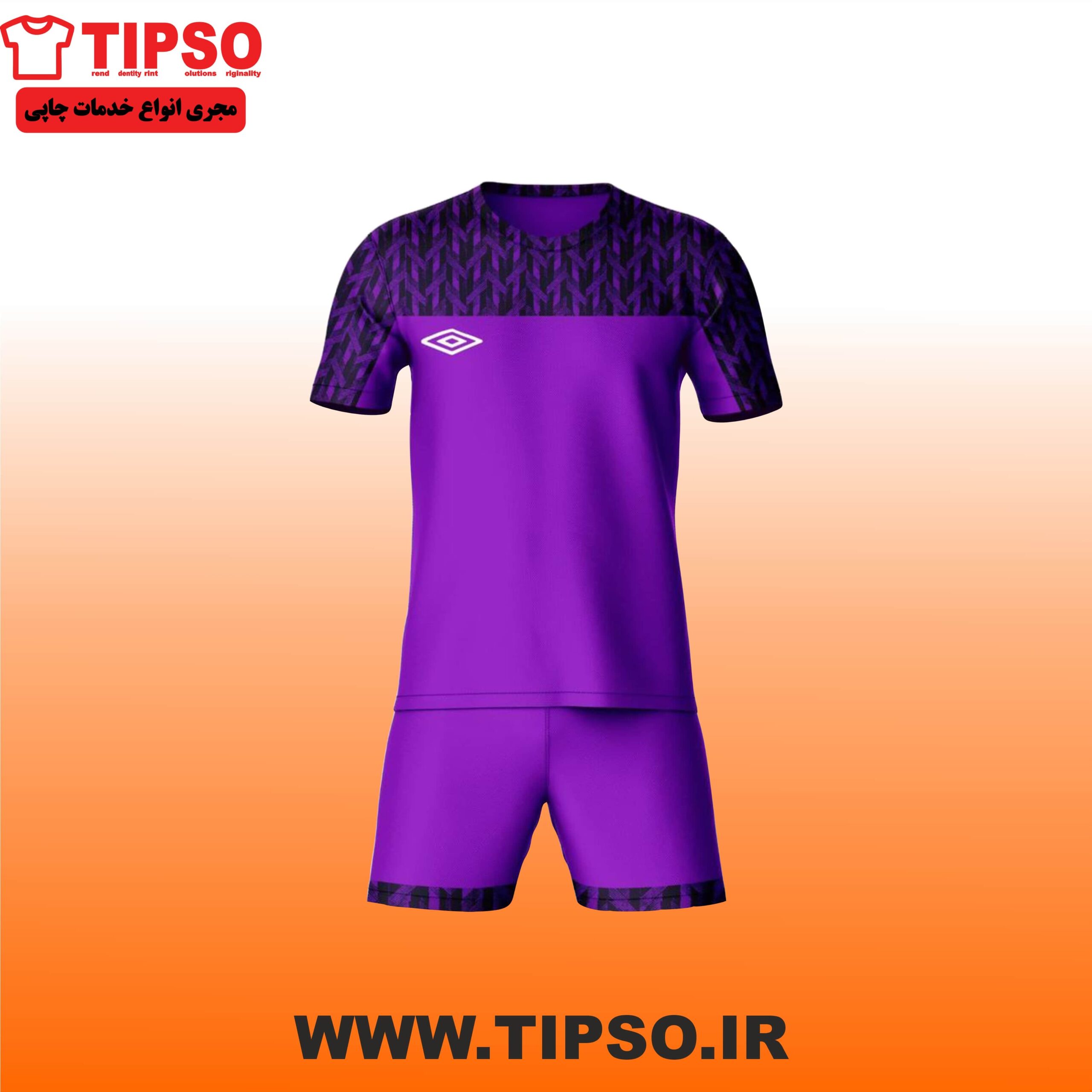 ست ورزشی مردانه شامل پیراهن آستینکوتاه و شورت ورزشی با رنگ بنفش خاص و طرح هندسی مشکی روی سرشانهها و کمر. لوگوی رسمی Umbro به رنگ سفید روی سینه، حس برندینگ ورزشی و کیفیت بالا را منتقل میکند.