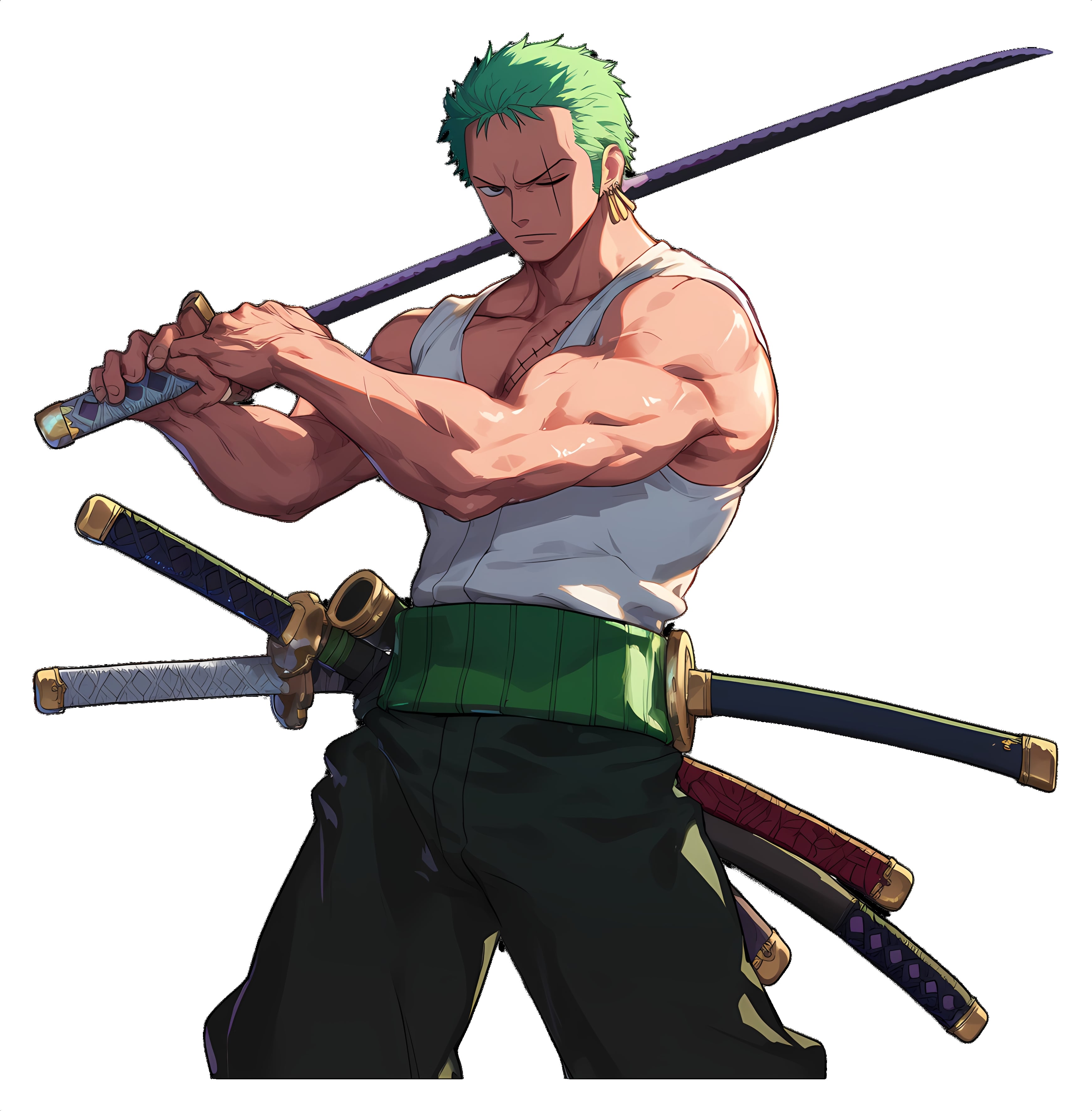 طرح پرجزئیات از شخصیت “رورونوا زورو” با موهای سبز، تی‌شرت سفید بدون آستین و شلوار سبز تیره. ژست رزمی با شمشیر در دست و سه کاتانا در غلاف با طراحی خاص روی دسته‌ها (قرمز، سفید، مشکی). چهره جدی و آماده نبرد، مناسب برای چاپ روی لباس‌های اسپرت، بچه‌گانه و نوجوانانه.